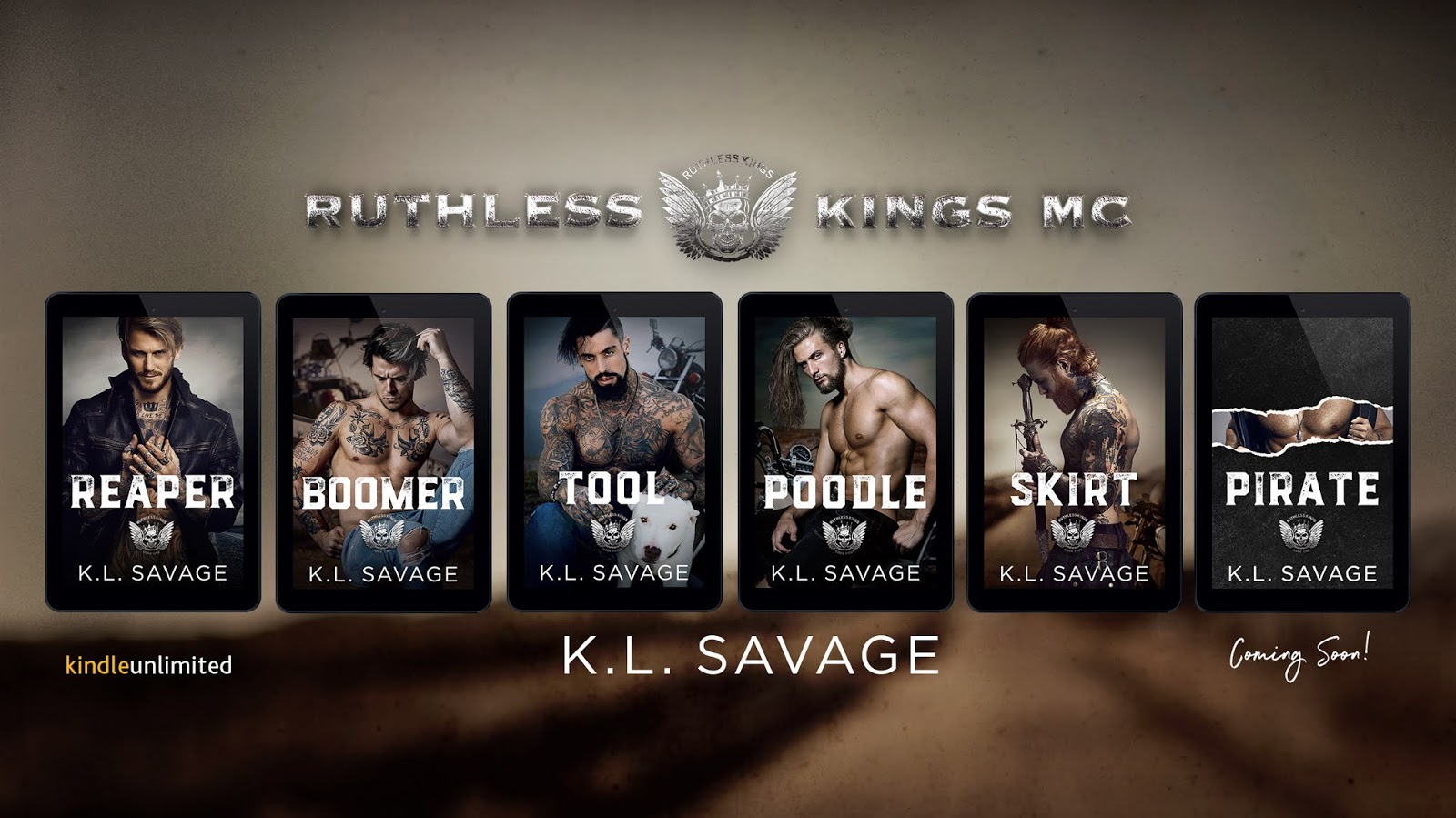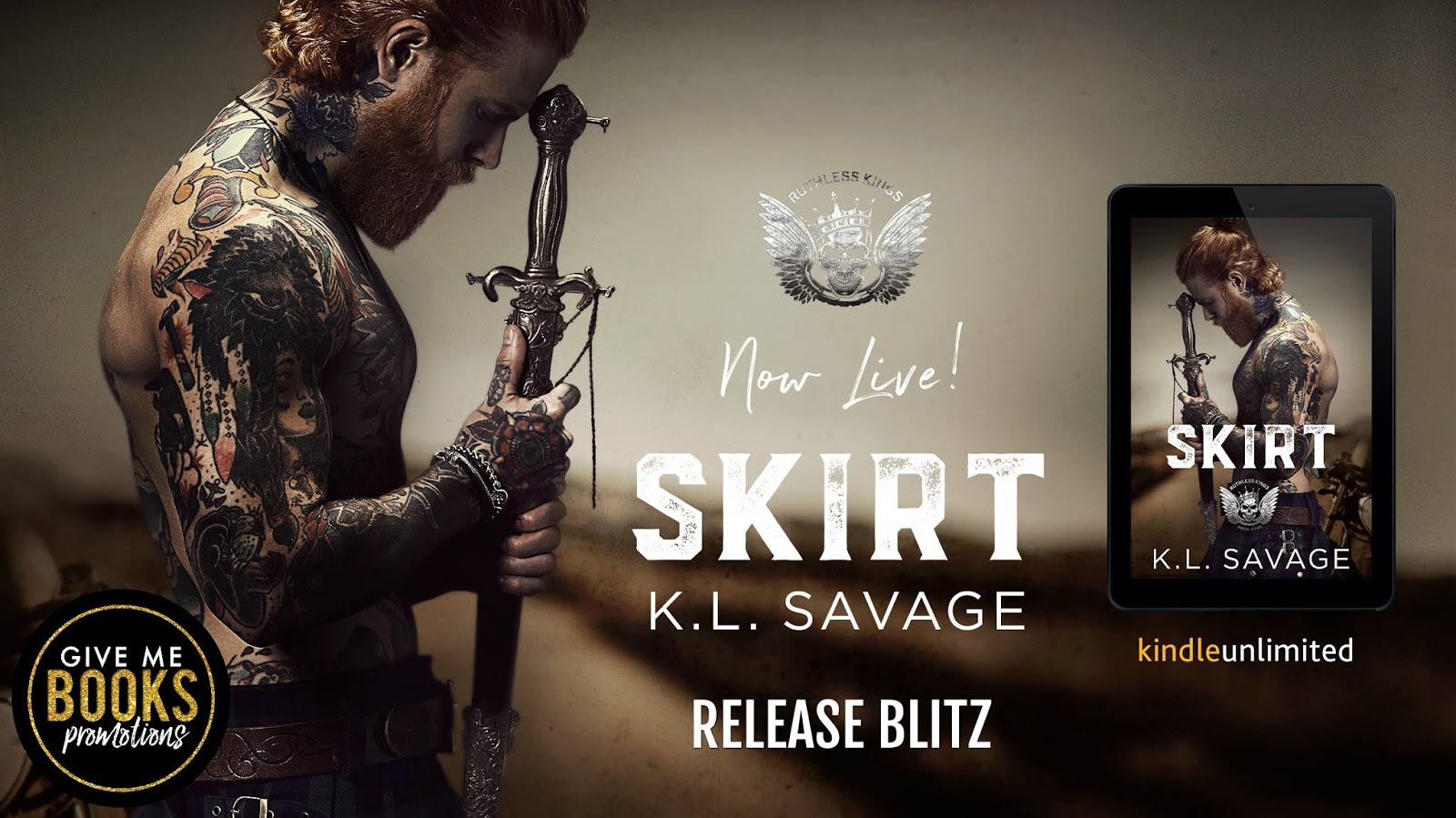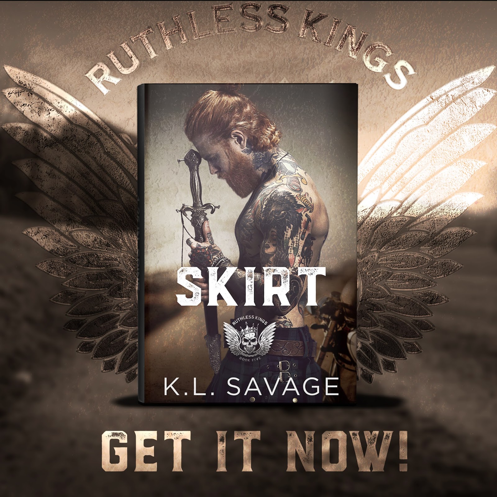 Title: SkirtSeries: Ruthless Kings MC #5 Author: K.L. Savage Genre: Dark Romance/Romantic Suspense Release Date: August 28, 2020BlurbThere are a few things people know about me. I'm Scottish with an accent to prove it. I really hate pants.I'm a Ruthless King. One thing people don't know? I don't fight because I have to. I breathe it. I live it. I love it. Flesh. Blood. Brass Knuckles. I lived my life fighting for nothing. Until I saw something worth fighting for. Her. Dawn belongs to one of my rivals. An Irish bloke with more power than common sense. The kind of man stupid enough to use it. And stupid enough to put bruises on her pretty face. This fight won't be my last. But it may be his. If he tries anything stupid with me? He's gonna find out that my MC always has my back. Even if it starts a war...Purchase Links$3.99 for a limited time!Free in Kindle UnlimitedAlso AvailableFree in Kindle UnlimitedFree in Kindle UnlimitedFree in Kindle UnlimitedFree in Kindle UnlimitedComing SoonReleasing October 2Author BioK.L. Savage decided they were tired of looking for the kind of books they wanted to read. They had an itch that needed to be scratched, and as every girl knows, nothing scratches better than an alpha. They write about gritty, alpha males, sometimes their dark sides, and the women they love. If you have the same itch, their alpha males should fix that.Author Links