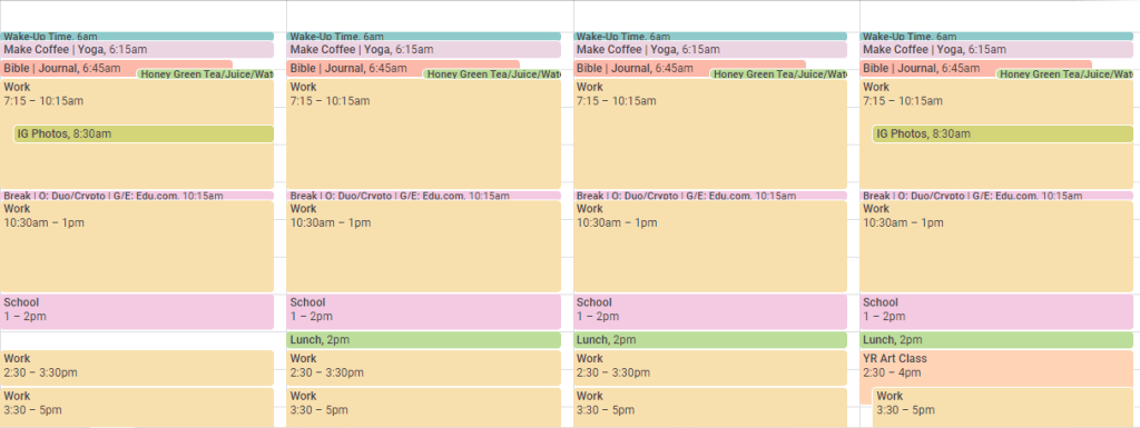 One of the very first things I did was create a time block schedule. Some people immediately know what this is and others its a new concept. But essentially I use my Google Calendar and have created a color block schedule with everything I know I need to do each day. It includes reminders for my morning yoga and journaling, the hours I am blocked off to work and the time I spend doing school lessons with my kids.