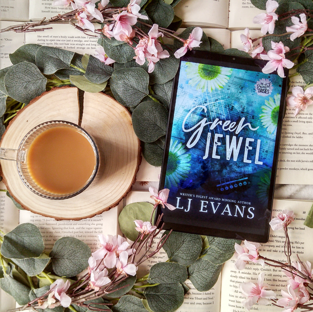 Green Jewel is the second book is The Painted Daisies series by LJ Evans. It follows the band of all female performers known as The Painted Daisies. In Book 1, Sweet Memory, we are introduced to the band and follow it’s youngest member Paisley as she falls for the boy from the other side of the tracks. At the end of Book 1 one of their band mates is killed and it tears them down to the core.