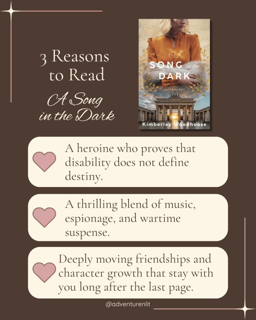 If you love historical fiction filled with courage, music, and faith woven against the backdrop of World War II, A Song in the Dark is a story you won’t want to miss.