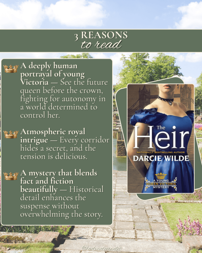 There are few things I love more than a historical mystery that blurs the line between fact and fiction—especially when royalty is involved. The Heir by Darcie Wilde swept me straight into the gilded yet suffocating halls of Kensington Palace and offered a fascinating look at young Victoria long before she became the formidable queen we think we know. If you enjoy mysteries layered with political tension, atmospheric palace intrigue, and a heroine who refuses to be silenced, this one belongs on your reading list.