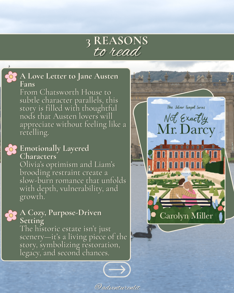 There’s something irresistible about a romance that tips its hat to Pride and Prejudice—especially when it’s set near the real-life inspiration for Pemberley itself. Not Exactly Mr. Darcy by Carolyn Miller blends literary nostalgia with a heartfelt contemporary romance, offering readers a story full of history, healing, and quietly transformative love.