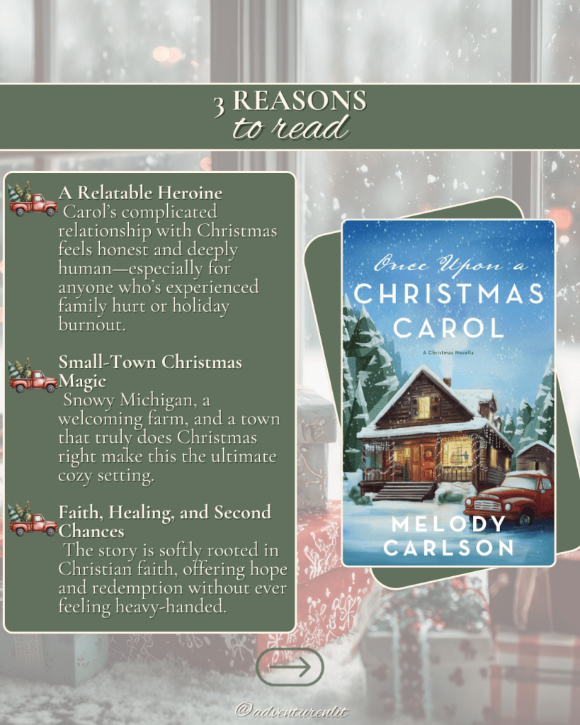 Sometimes the stories we need most during the holidays are the quiet ones—the ones about healing old wounds, rediscovering joy, and learning to see familiar seasons with fresh eyes. Once Upon a Christmas Carol by Melody Carlson is exactly that kind of story. Perfect for a winter afternoon or a cozy evening by the tree, this novella blends faith, romance, and Hallmark-movie charm into a gentle reminder that Christmas can still surprise us.