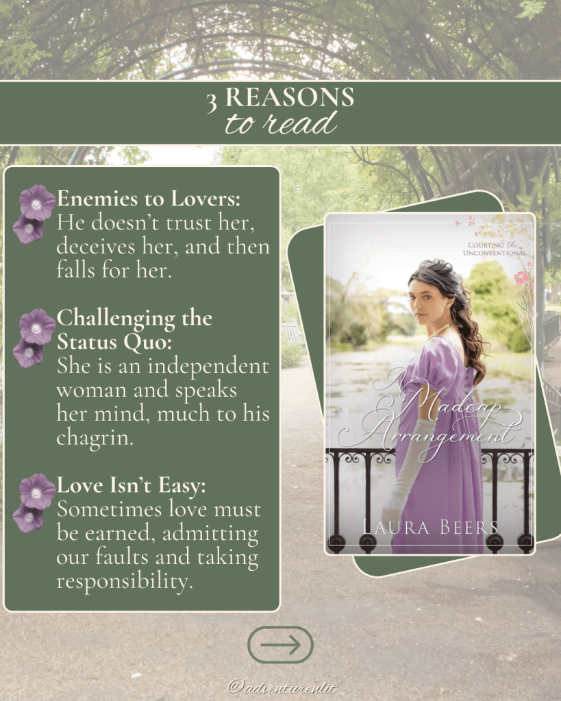 Laura Beers books always help me pause and reflect on people’s characteristics. She features characters who must overcome something that holds them back and this book is no different. Theodosia is a magnificently brave and intelligent woman. Her father recently passed on and she has taken over the sole responsibility of running the family estate. It’s in a small village, but it’s certainly no small feat for a young woman to take on this responsibility, and love what she does as well.