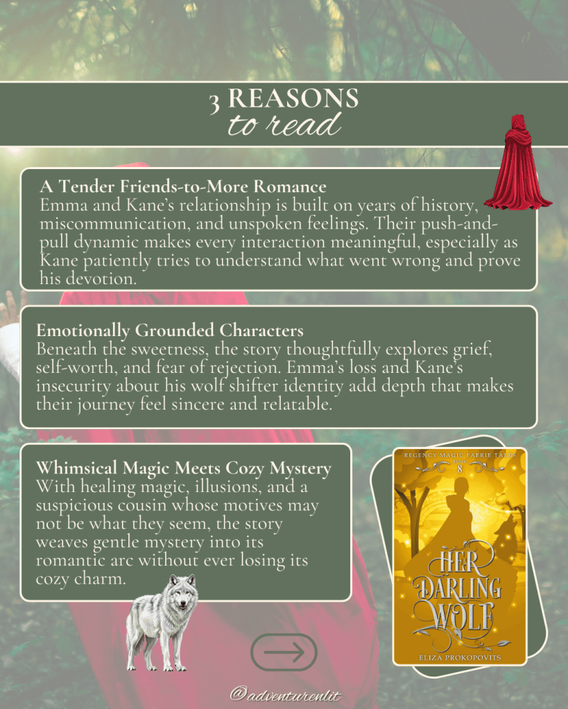 There’s something especially comforting about a story that blends familiar fairytale threads with gentle romance, emotional healing, and just a touch of magic. Her Darling Wolf by Eliza Prokopovits is exactly that kind of read: warm, whimsical, and quietly heartfelt. With a Regency-inspired setting, fae magic, and a misunderstood wolf shifter hero, this YA retelling of Little Red Riding Hood offers a story about trust, loyalty, and finding the courage to be honest with the people who matter most.