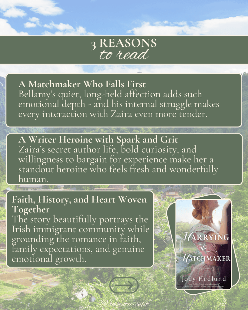 There’s something especially charming about a romance where the matchmaker becomes the one caught in the web of love – and Marrying the Matchmaker by Jody Hedlund does exactly that. Set within St. Louis’s Irish immigrant community, this story blends humor, heart, faith, and irresistible romantic tension into a tale that feels both cozy and emotionally rich. If you enjoy clever bargains, growing attraction, and characters who fall long before they admit it, this book might just steal your heart.
