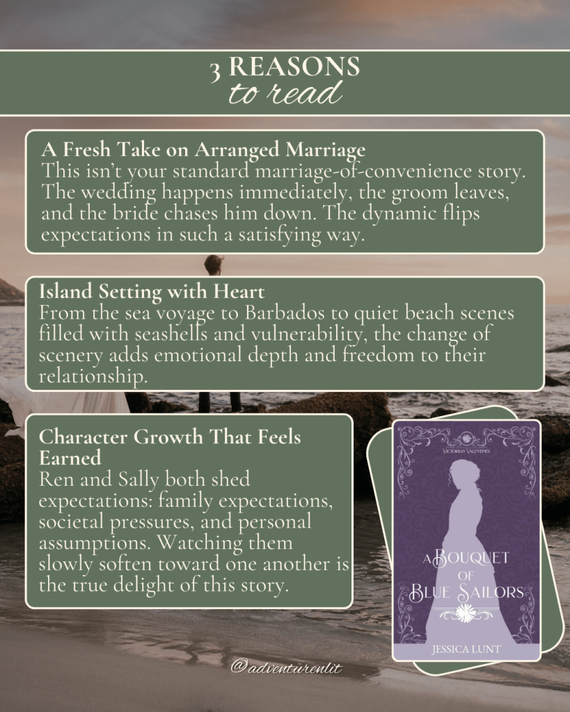 There’s something irresistibly compelling about a marriage that begins with uncertainty. A Bouquet of Blue Sailors by Jessica Lunt takes the familiar arranged-marriage trope and sends it somewhere entirely unexpected – across the sea. What begins as a potentially loveless convenience blossoms into something far richer, set against the backdrop of ocean voyages and island shores.