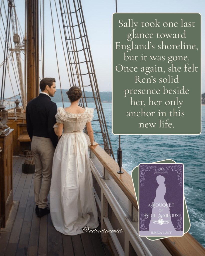 Sally is determined to not be left behind and her constitution is one to be admired. I think I probably would have done the same thing in her position. She quickly packs her things and heads to the docks to intercept her new husband and not allow him to leave anywhere without her. Having spent her life as kind of a background fixture in her family, she’s determined not to have that with her new husband.