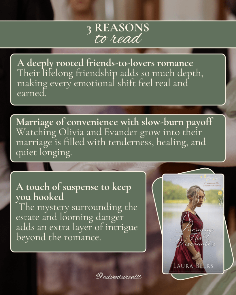 If you love a romance that blends heartfelt emotion with just a touch of danger, Pursuing His Viscountess by Laura Beers is one to add to your list. With a foundation of lifelong friendship, a marriage of convenience, and a quiet thread of suspense, this story delivers both warmth and intrigue. It’s the kind of Regency romance that gently pulls you in—and keeps you rooting for love every step of the way.